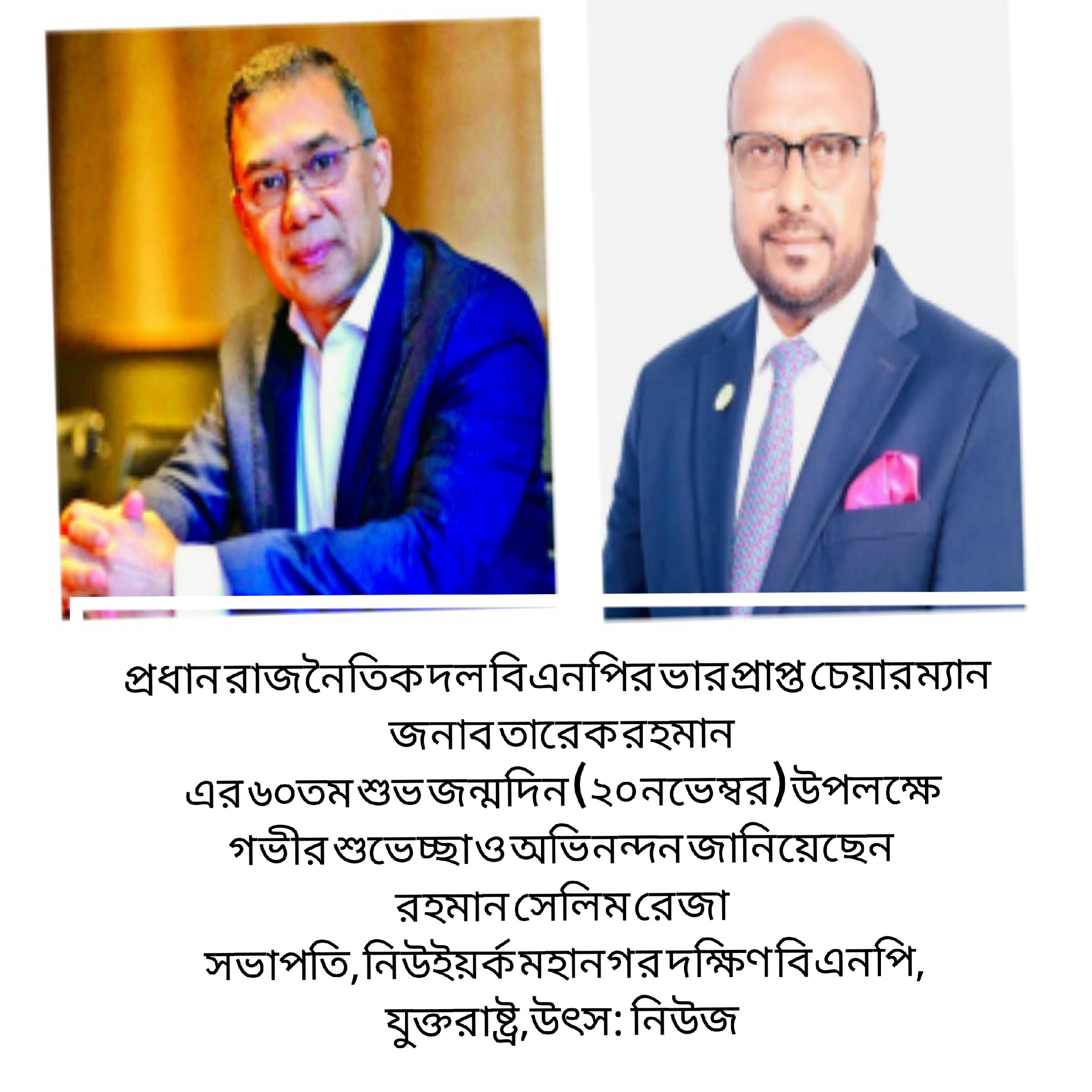 হাকিকুল ইসলাম খোকন,এর বিশেষ প্রতিবেদন, বাপসনিউজঃ বাংলাদেশের অন্যতম প্রধান রাজনৈতিক দল বিএনপির ভারপ্রাপ্ত চেয়ারম্যান তারেক রহমানের ২০ নভেম্বর ৬০ তম শুভ জন্মদিন উপলক্ষে গভীর শুভেচ্ছা ও অভিনন্দন জানিয়েছন রহমান সেলিম রেজা সভাপতি নিউইয়র্ক মহানগর দক্ষিন বিএনপি যুক্তরাষ্ট্রে।খবর আইবিএননিউজ ।