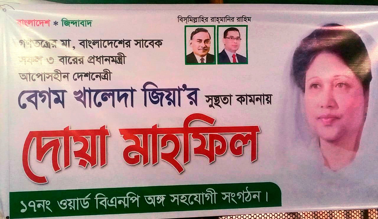 খুলনা, সোনাডাঙা থানা, ১৭ নংওয়ার্ড বি এন পি অঙ্গ সহযোগী সংগঠন আয়োজিত, নিউজ-দৈনিক দেশের নিউজ- এর বিশেষ প্রতিনিধি -মোাঃ রফিকুল ইসলাম। গনতন্ত্রের মা, বাংলাদেশ সাবেক সফল তিন বারের প্রধানমন্ত্রী আপোষহীন দেশনেত্রী - বেগম খালেদা জিয়া র সুস্ত তা কামনায় " দোওয়া মাহফিল।।