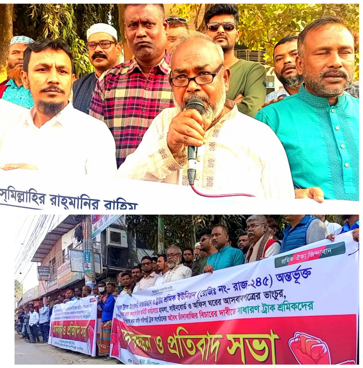 দিনাজপুর জেলা ট্রাক, ট্যাংকলরী, কাভার্ডভ্যান ও ট্রাক্টর শ্রমিক ইউনিয়ন (রেজিঃ নং–রাজ-২৪৫) এর অন্তর্ভুক্ত কাহারোল থানা শ্রম কল্যাণ উপ-কমিটি কার্যালয়ে হামলা, সাইনবোর্ড ও অফিস ঘর ভাঙচুর, মূল্যবান কাগজপত্র লুট ও শ্রম আইনে বিচার দাবিতে মানববন্ধন ও প্রতিবাদ সভা অনুষ্ঠিত হয়েছে।