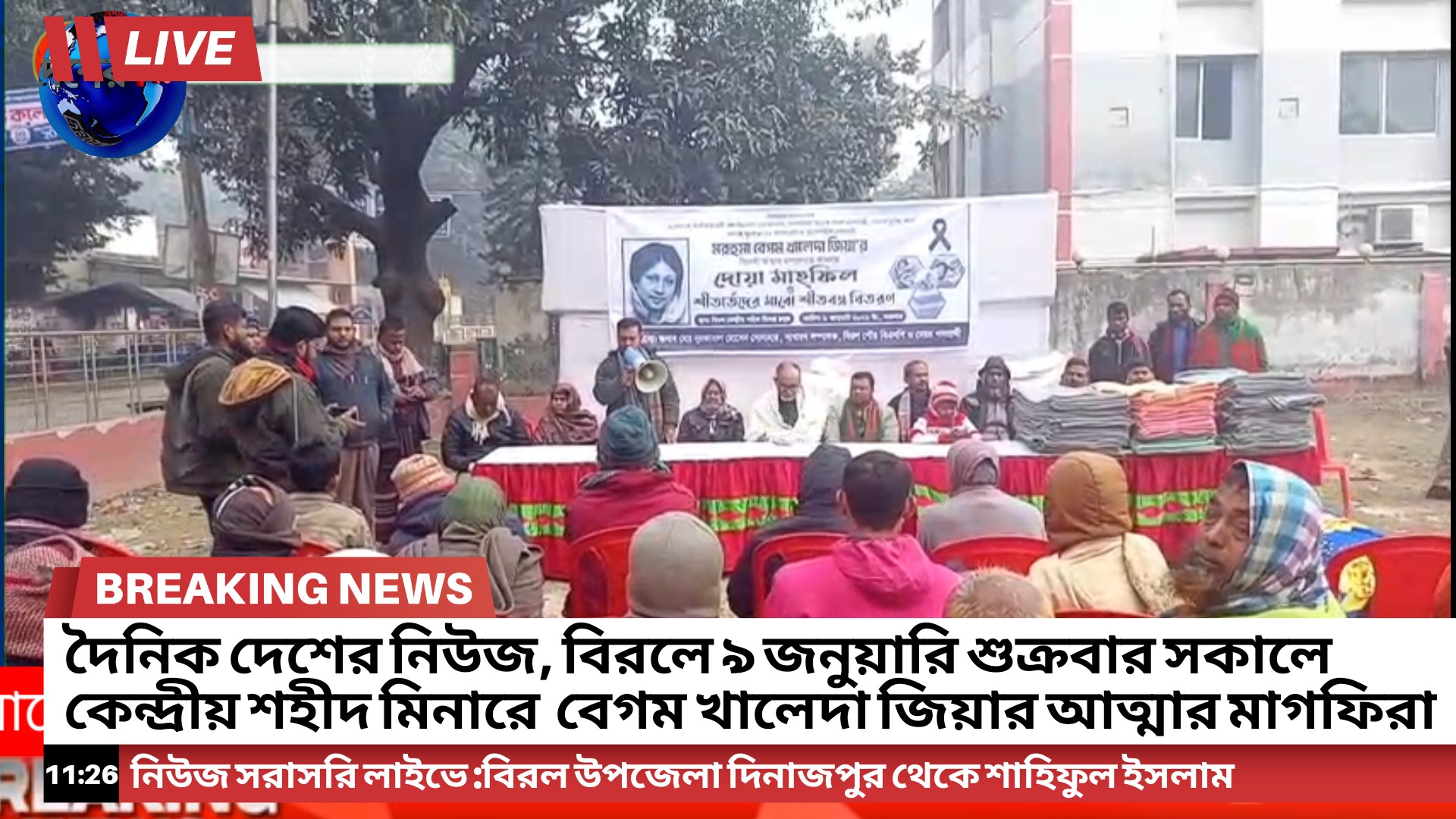 নিউজ দৈনিক দেশের নিউজ বিশেষ ; প্রতিনিধি মোঃ সাহিফুল ইসলাম এর পাঠানো ভিডিও চিএ নিউজ, বিরলে ৯ জানুয়ারি শুক্রবার সকালে কেন্দ্রীয় শহীদ মিনারে বেগম খালেদা জিয়ার আত্মার মাগফিরাত কামনা দোয়া মাহফিল ও শীতবস্ত বিতরণের আয়োজন করেছে বিরল পৌর বিএনপির সাধারণ সম্পাদক মোঃ নুরুজ্জামান হোসেন। (সোনাহার)