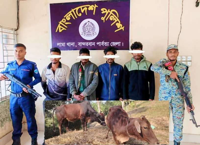 মোঃ মেহেরাজ উদ্দিন মিন্টু, বান্দরবানঃ বান্দরবান পার্বত্য জেলার লামা থানা পুলিশের অভিযানে চোরাইকৃত দুইটি গরু ও টাকা উদ্ধারসহ চারজন চোরচক্রের সদস্যকে গ্রেপ্তার করা হয়েছে। অভিযানে গরু বিক্রির নগদ ৬২ হাজার টাকাও উদ্ধার করা হয়।