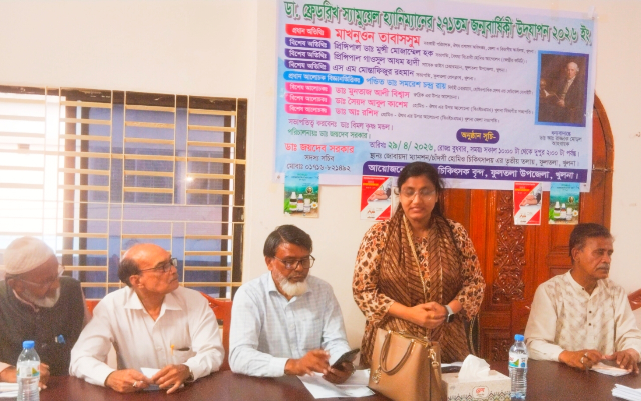 খুলনার ফুলতলায় জোবায়দা ম্যানশনে গতকাল বুধবার সকাল ১০ টায় ডাঃ ফ্রেডরিক স্যামুয়েল হ্যানিম্যানের ২’শ ৭১তম জন্ম জয়ন্তী উপলক্ষ্যে ডাঃ জয়দেব সরকারের পরিচালনায় এ অনুষ্ঠানের আয়োজন করা হয়। হাফেজ সাব্বির হোসেন এর পবিত্র কোরআন তেলাওয়াত ও ডাঃ বিনয় কৃষ্ণ মন্ডলের গিতা পাঠ ও তার সভাপতিত্বে অনুষ্ঠানের সুচনা করেন। ডাঃ সৈয়দ আবুল কাশেমের সঞ্চালনায় খুলনা বিভাগীয় সহকারী পরিচালক ঔষধ প্রশাসন অধিদপ্তর মাখনুওন তাবাসসুম প্রধান অতিথির বক্তৃতায় বলেন দেশের মানুষের বড় একটি অংশ হোমিওপ্যাথিক চিকিৎসা ব্যবস্থার সাথে সম্পৃক্ত। বর্তমান আধুনিক চিকিৎসা ব্যবস্থার সাথে হোমিও চিকিৎসাকে অন্তর্ভুক্ত করা গেলে আরো বেশী মানুষ উপকৃত হবে বলে তিনি জানান। ডা. স্যামুয়েল হ্যানিম্যানকে চিকিৎসা শাস্ত্রের অন্যতম একজন জনক হিসেবে উল্লেখ করে প্রধান অতিথি আরো বলেন, মানবতাবাদী হিসেবে তিনি সারা বিশ্বের মানুষের কাছে সমাদৃত। তার প্রবর্তিত হোমিওপ্যাথি চিকিৎসা ব্যবস্থার খুলনা ফুলতলা উপজেলার এই মহান পেশার সাথে সম্পৃক্তদের কাজের সুষ্ঠু পরিবেশ নিশ্চিত করতে প্রধান অতিথি কাজ করবে বলে উল্লেখ করেন। সেই সাথে সকল হোমিও চিকিৎসকদের ড্রাগ লাইসেন্স বাধ্যতামূলক ভাবে করতে হবে। তা নাহলে কেউ ঊষধ বিক্রি করতে পারবে না। যারা এখনো পর্যন্ত ড্রাগ লাইসেন্স করতে পারেন নাই তাদের লাইসেন্স এর ব্যাবস্থা করা হবে এই আশা ব্যক্ত করেন। একইসাথে খুলনার সকল হোমিও চিকিৎসকদের সার্বিক সহযোগিতা কামানা করেন। উক্ত অনুষ্ঠান বিশেষ অতিথি হিসেবে উপস্থিত প্রিন্সিপাল ডাঃ মুন্সি মোজাম্মেল হক সভাপতি হোমিও আন্দোলন, এস এম মোস্তাফিজুর রহমান সভাপতি ফুলতলা প্রেসক্লাব, সাধারণ সম্পাদক গৌর হরি দাস, এস এম মমিনুর রহমান, প্রধান আলোচক ডাঃ সমরেশ চন্দ্র রায়, ডাঃ মুনতাজ আলী বিশ্বাস বিভাগিয় সভাপতি হোমিওপ্যাথ, ডাঃ সৈয়দ আবুল কাশেম, ডাঃ আব্দুর রশিদ, ডাঃ সুব্রত বিকাশ মন্ডল ডাঃ বিমল কৃষ্ণ মন্ডল প্রমুখ।