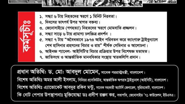 জেনোসাইড ’৭১ ফাউণ্ডেশন ইউএসএ এর সেমিনার ৭ ডিসেম্বর, রবিববার নিউজ দৈনিক দেশের নিউজ. বিশেষ প্রতিনিধি নিউইয়কের থেকে পাঠানো তথ্যের নিউজ ;হাকিকুল ইসলাম খোকন,বাপসনিউজঃ জাতিসংঘ কর্তৃক জেনোসাইড (গণহত্যা) অপরাধের ভিকটিমদের সম্মান